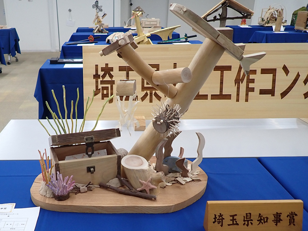 まず埼玉県知事賞(小学校の部)では「宝箱が眠る海」を選出しました。丸太を中心に海の 中を表現し、ゆるやかな水の流れが上手に表現されています。また宝箱の存在が、語られてい ない物語を強く感じさせます。一つ一つの部品も丁寧に作られており、愛らしい生き物たちが 彩る海の表現が高く評価されました。