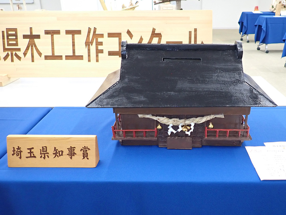 埼玉県知事賞(中学生の部)では、「幸福神社(意見箱)」が選出されました。伝統的な木造 建築である神社をモチーフに、みんなが意見を出し、その実現を願う意見箱に仕上げたアイデ アと、作者の作品への思いが高く評価されました。屋根部分の接合などは中学生らしく、正確 に、丁寧に仕上げられています。実際の寺社建築の様式を取り入れたら、さらに良くなるでし ょう。とても風格のある作品です。