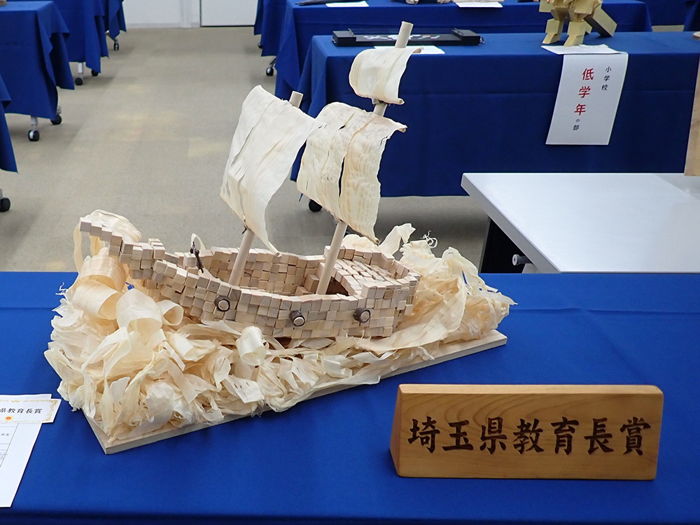 埼玉県教育長賞には、「最強海賊船」が選ばれました。1cm のブロック木片を根気強くつな げた努力、かんなくずで表現された荒々しい海、風を受ける帆などの臨場感が高く評価されま した。それぞれの木材の特徴、質感がよく生かされた作品です。